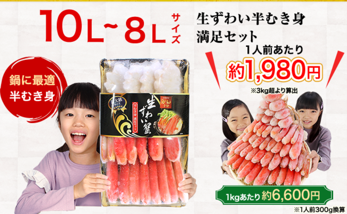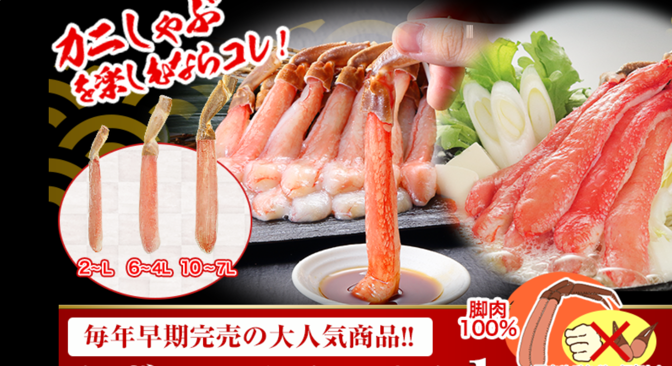 この企業努力の結果、「訳なし」の高品質なカニを、「訳あり」並みの価格で購入できるのが、かに本舗最大の魅力です。