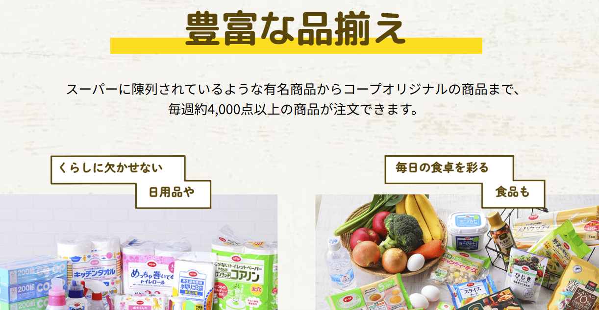 食品だけでなく、日用品や子ども用品、衛生用品まで幅広く注文できる点も魅力です。